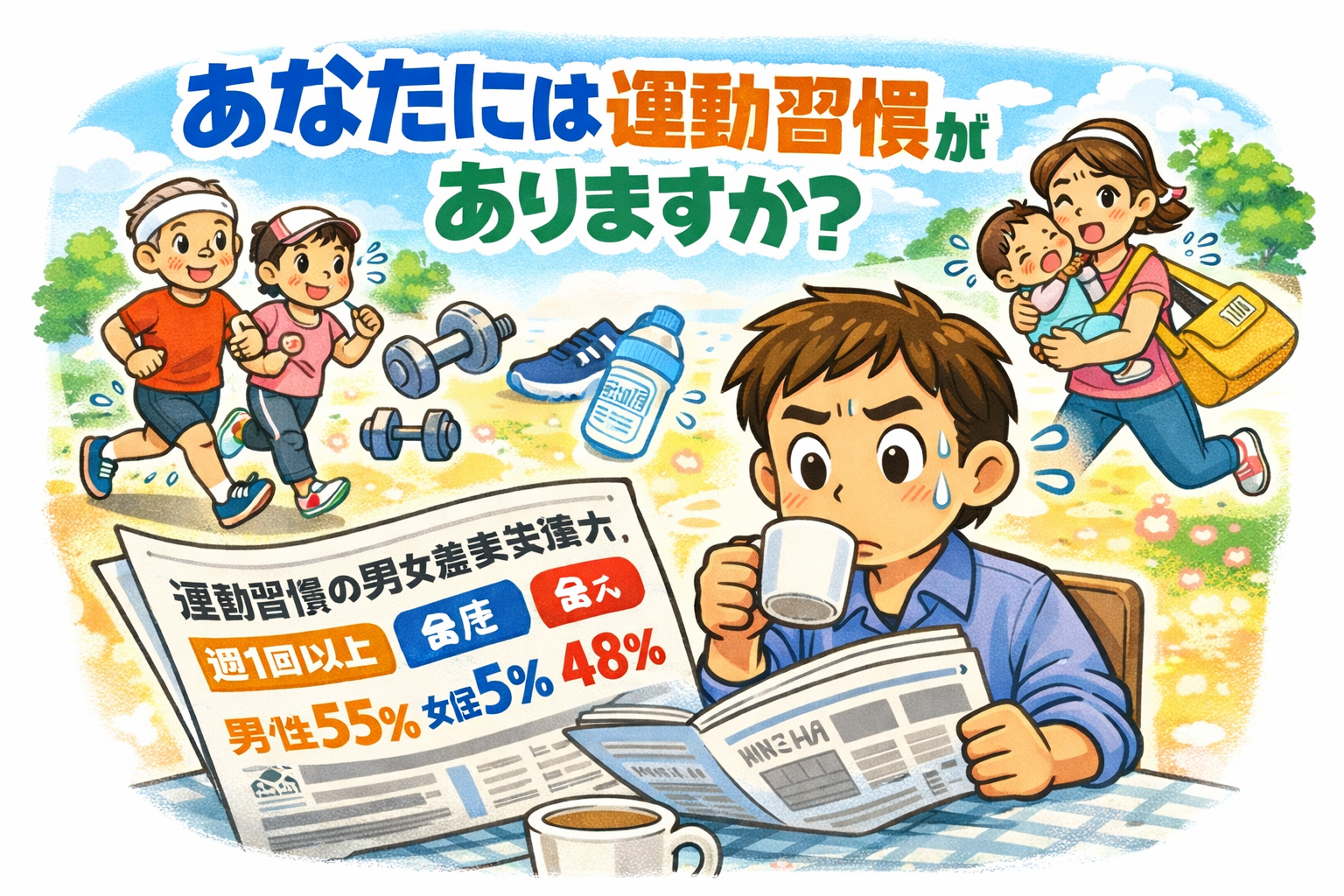 コロちゃんが、朝コーヒーを飲みながら新聞をバサバサ読んでいると「運動習慣の男女差最大/週1回以上/男性55%、女性48%」との見出しが目に入りましたよ。
