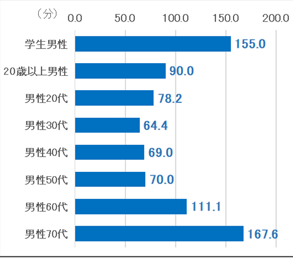 うーむ、上記をみると「男性も女性も」、「コロちゃん年代の⑦70代」が「男性は167分、女性が120分」で最大ですよね。