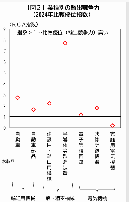 その内容は、「製造業」の輸出競争力を示す「顕示比較優位指数」を持ちいて、「2024年の国内製造業の輸出競争力」を発表していましたね。以下でしたよ。