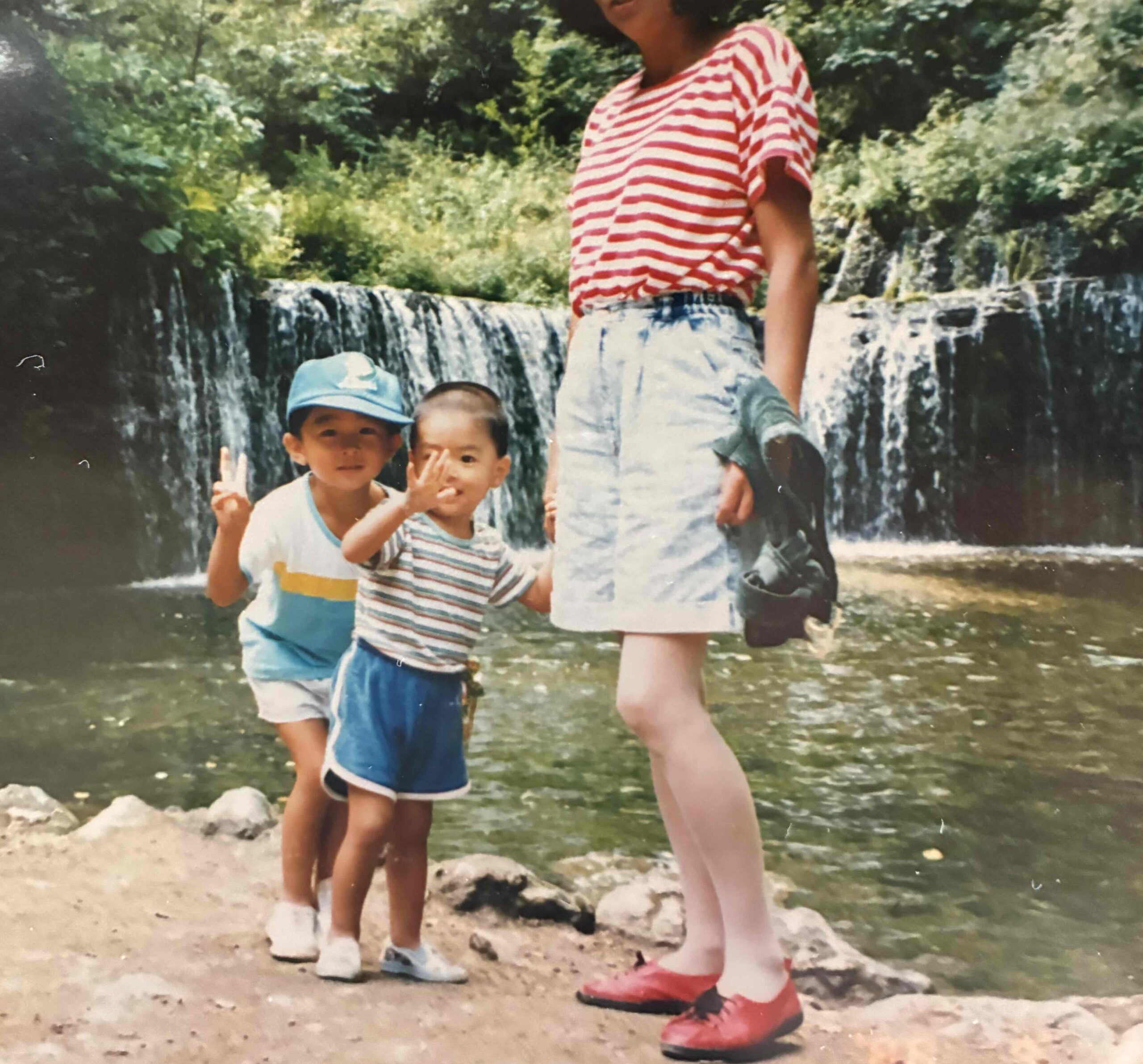 下記のフォトは、1988年の「軽井沢の白糸の滝」です。妻と4歳と2歳の子どもたちですよね。
