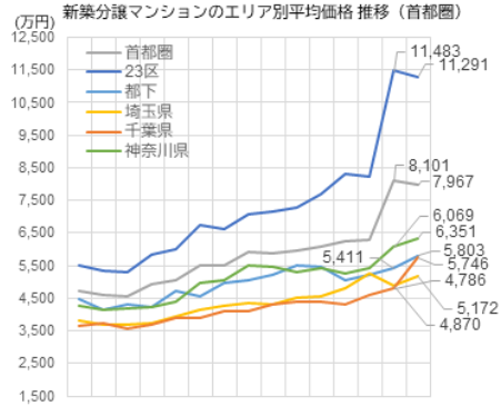 まず最初に「東京23区内・都下」と、それ以外の「東京圏内(神奈川県・千葉県・埼玉県)」の住宅価格を調べてみましょう。