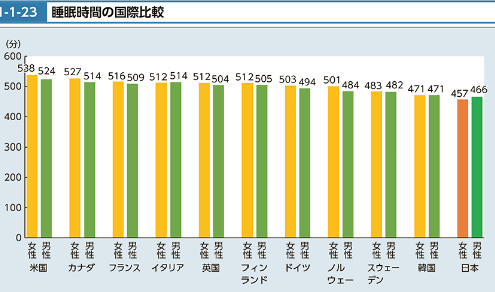 ☆「日本は先進国で最も睡眠不足だってと、睡眠時間の国際比較を見るよ」