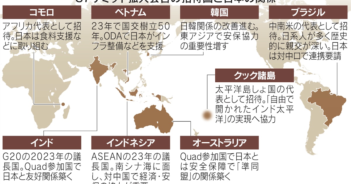 この記事によると、今年の5月19~21日に予定され、広島で開かれる「主要7ヶ(G7サミット)」の際に、G7枠外の8ヶ国の首脳を招くとありました。