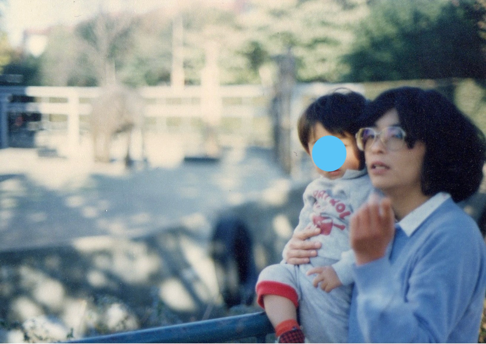 妻と長男のフォトのバックには「ぼやけた像」が見えますね。「ゾウ舎」の前で撮ったのでしょうね。この時代にはまだ「デジカメ」がありません。