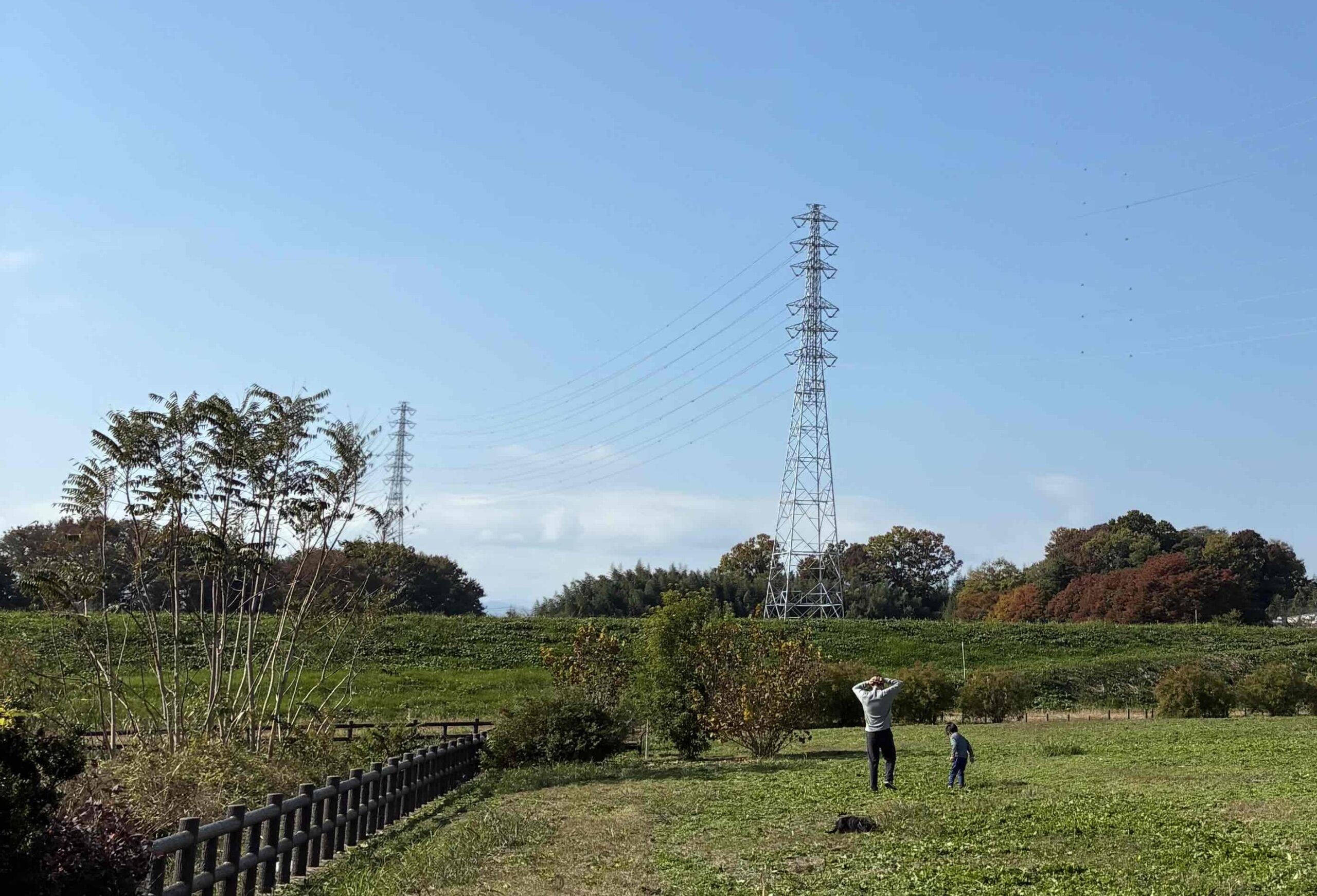 下記のフォトは、この日の「青空と広々とした公園と次男+すーくん(5歳)+ワンコのフォト」です。人間とワンコが小さいですよ。