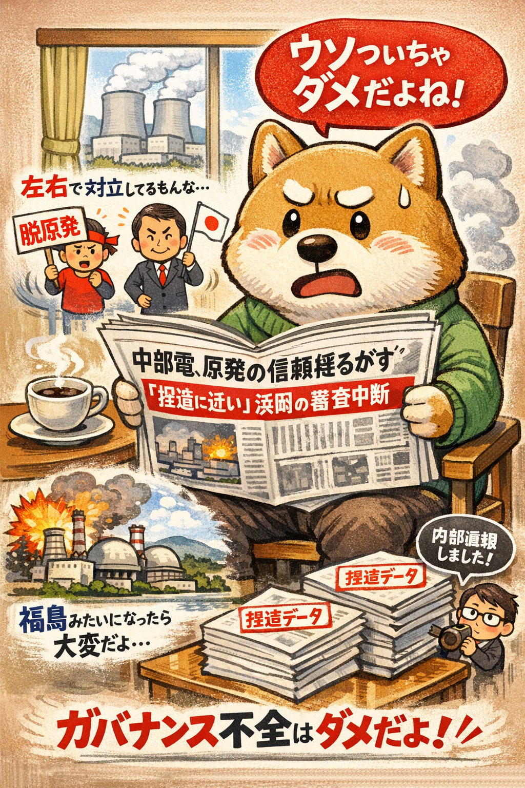 コロちゃんが、朝コーヒーを飲みながら新聞をバサバサ読んでいると「中部電、原発の信頼揺るがす/『捏造に近い』浜岡の審査中断 ガバナンス不全露呈」との見出しが目に入りました。