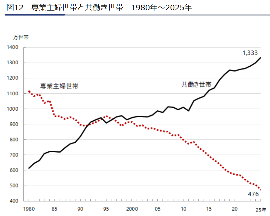 上記のグラフは、「独立行政法人労働政策・研究機構」が発表した「1980~2025年」の「専業主婦世帯と共働き世帯数の推移」です。