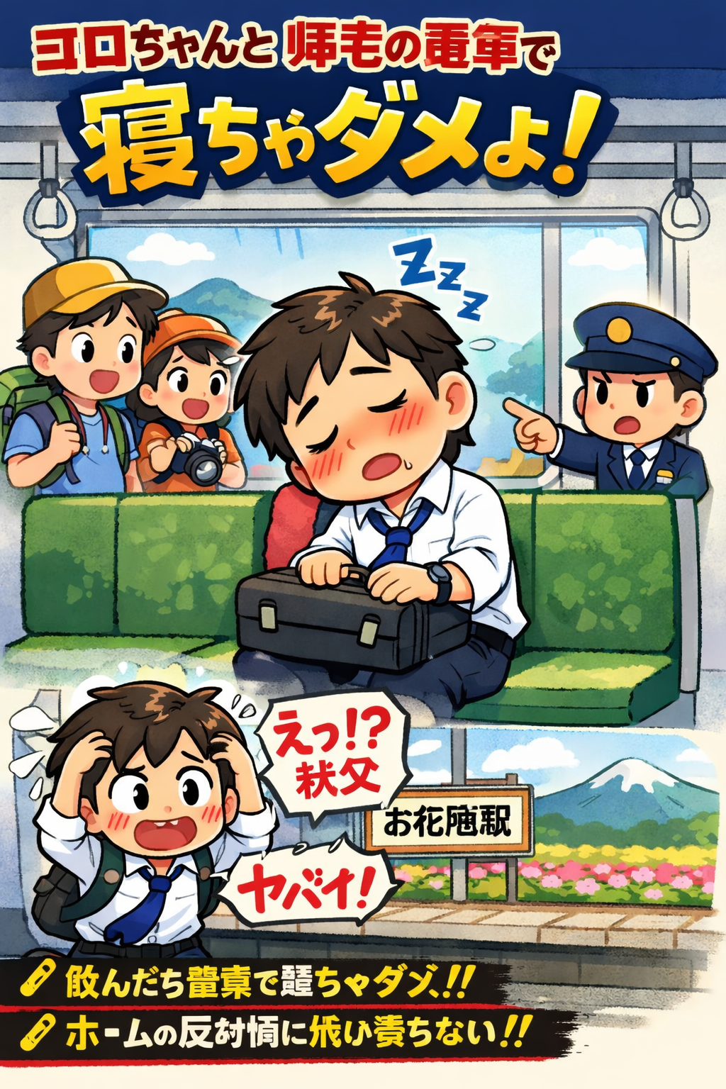 あー、皆さん「お酒を飲んだら電車内で寝ちゃダメ」ですよ。そして「終点で目が覚めても、あわてて「ホームの反対側の電車に飛び乗っちゃダメ」ですからね。
