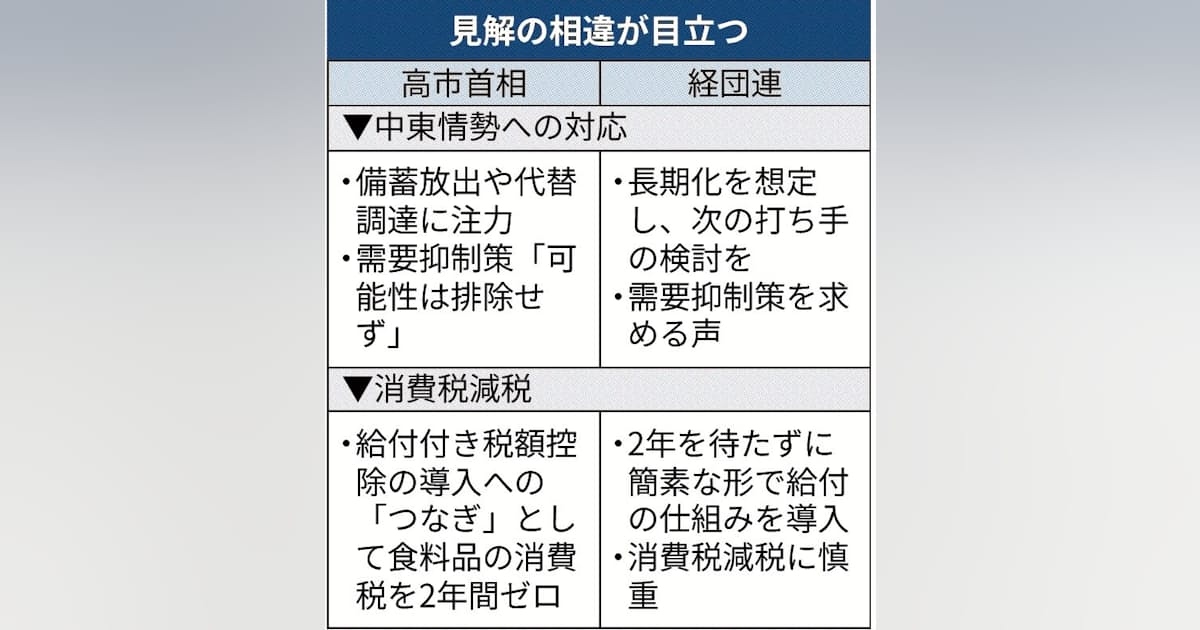 冒頭の記事の見出しでは、「首相/石油備蓄放出や補助金」と「経団連/長期化視野に需要抑制」と並べて比較していました。
