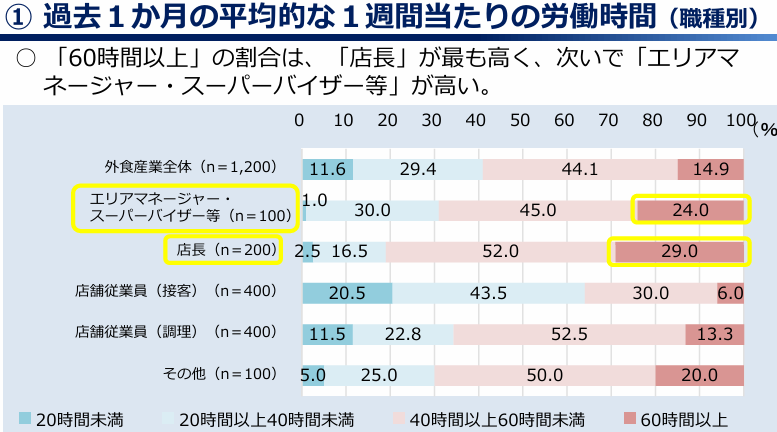 なになに「外食産業の店長さん」は、残業時間が「➀週60時間以上(過労死水準)」が3割(29%)もいますよ。