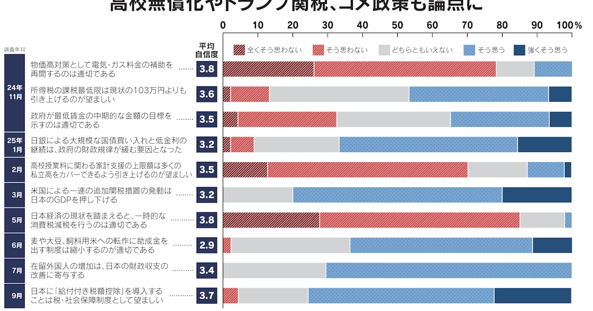 しかし、「経済学者50人」の方たちの反対意見は、「①電気ガス代補助では77%」、「②の消費税減税では85%」、「③の高校無償化では70%」と圧倒的に「反対意見」が多いですよ。