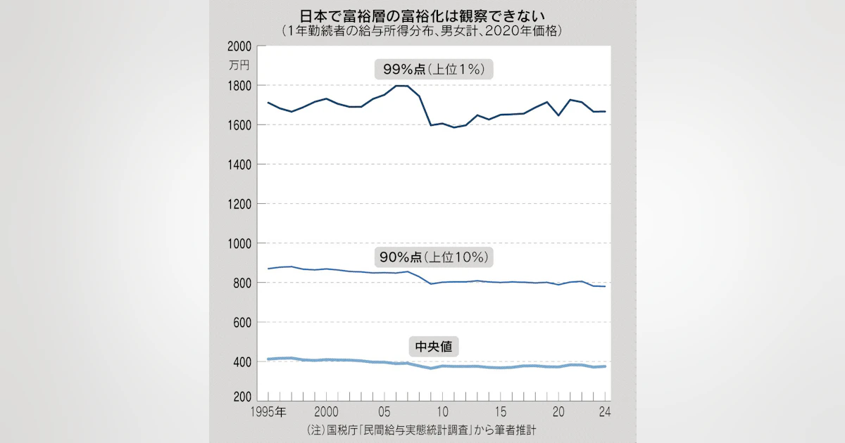 この「論考」で最初に「楡井教授」が書いているのが、「(2000年代以降の)日本の給与分布は富裕層が富裕化しているわけでも、格差が顕著に拡大しているわけでもない」です。