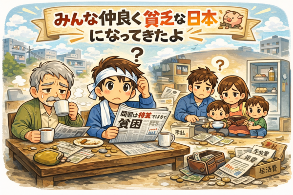 ①「格差が拡大していない(ジニ係数が上がってない)のに、給与の中央値が30年間で9%も縮んだということは『みんな仲良く貧乏になった』ということだよね」