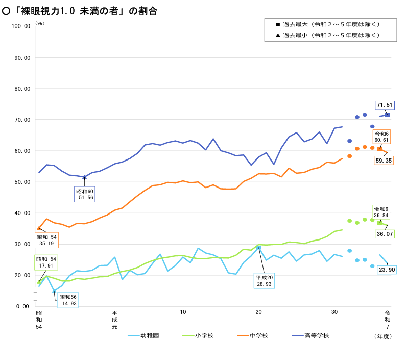 上記のグラフは、「文部科学省」が発表した「裸眼視力1.0未満の者の割合の推移」です。