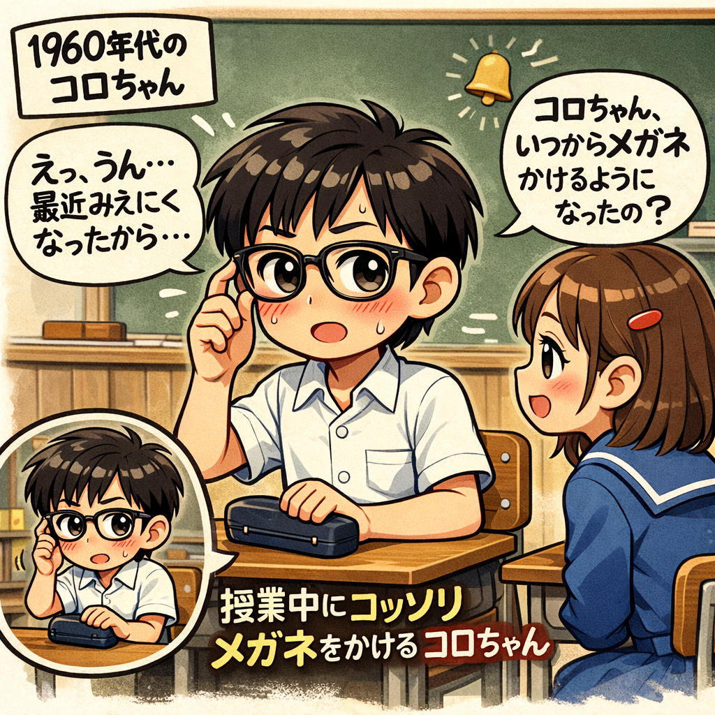 「少年コロちゃん」は、初めての「メガネ男子デビュー」が恥ずかしくて、「授業中」にコッソリ「メガネ」を出すと、周囲に気づかれないように「ソッ」とかけていたのですよね。