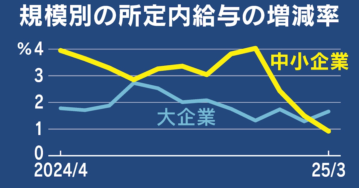 この「石破総理の実質賃金1%増目標」に対して、この「新聞記事」では「厚生労働省が発表した毎月勤労統計調査」から「中小、賃上げ急ブレーキ」と書いています。