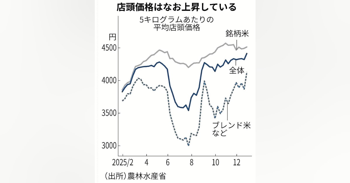 記事では「農水省が発表した2025年12月29日~26年1月4日時点のコメの平均店頭価格は5㌔あたり4416円と、集計を始めた22年3月以来の最高値を更新した」と報じています。