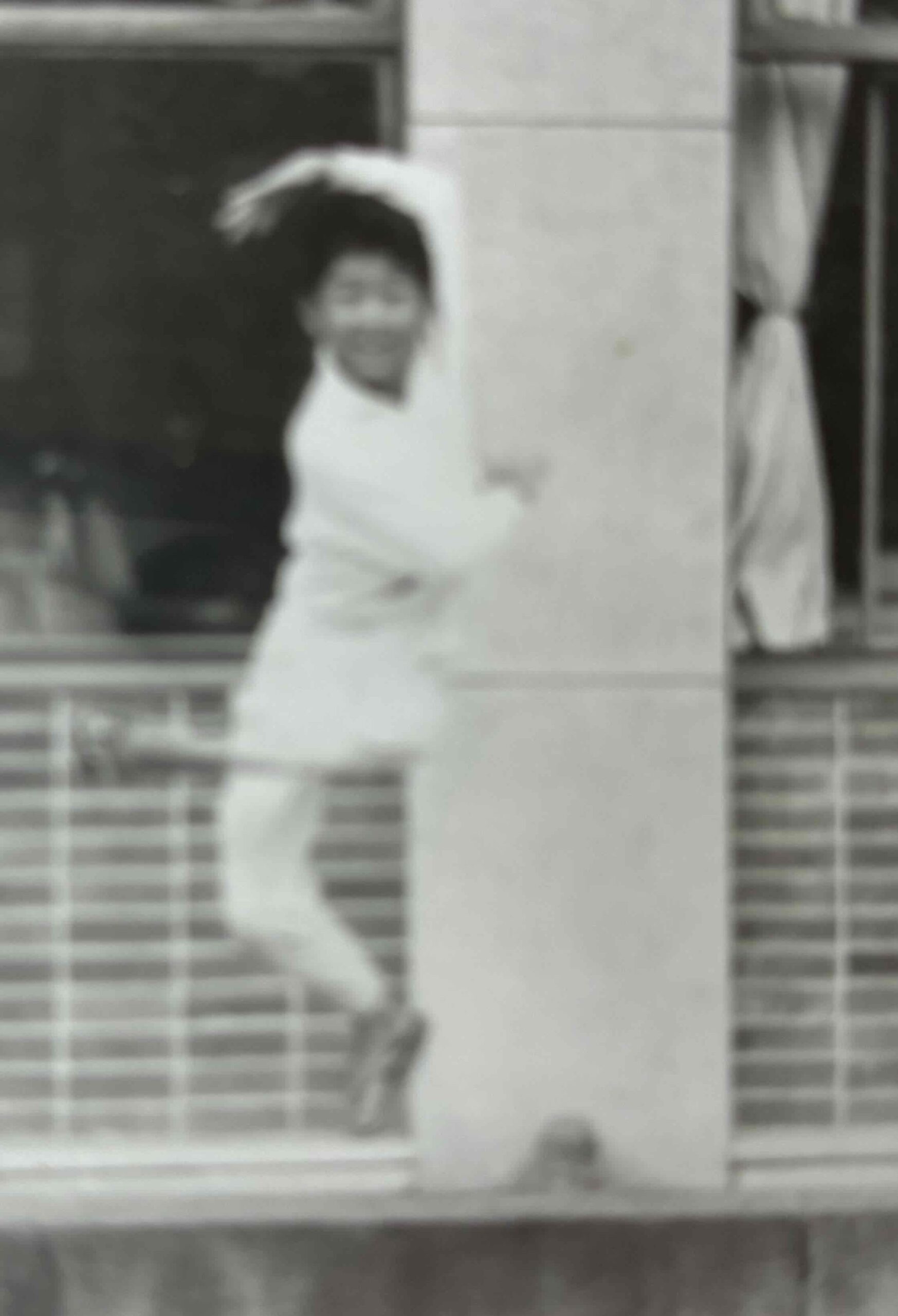 下記のフォトは、その「図書館」の前で「飛び上がってシェーをする」コロちゃんです。たぶん「小学校4年生の頃」かと思われますよ。
