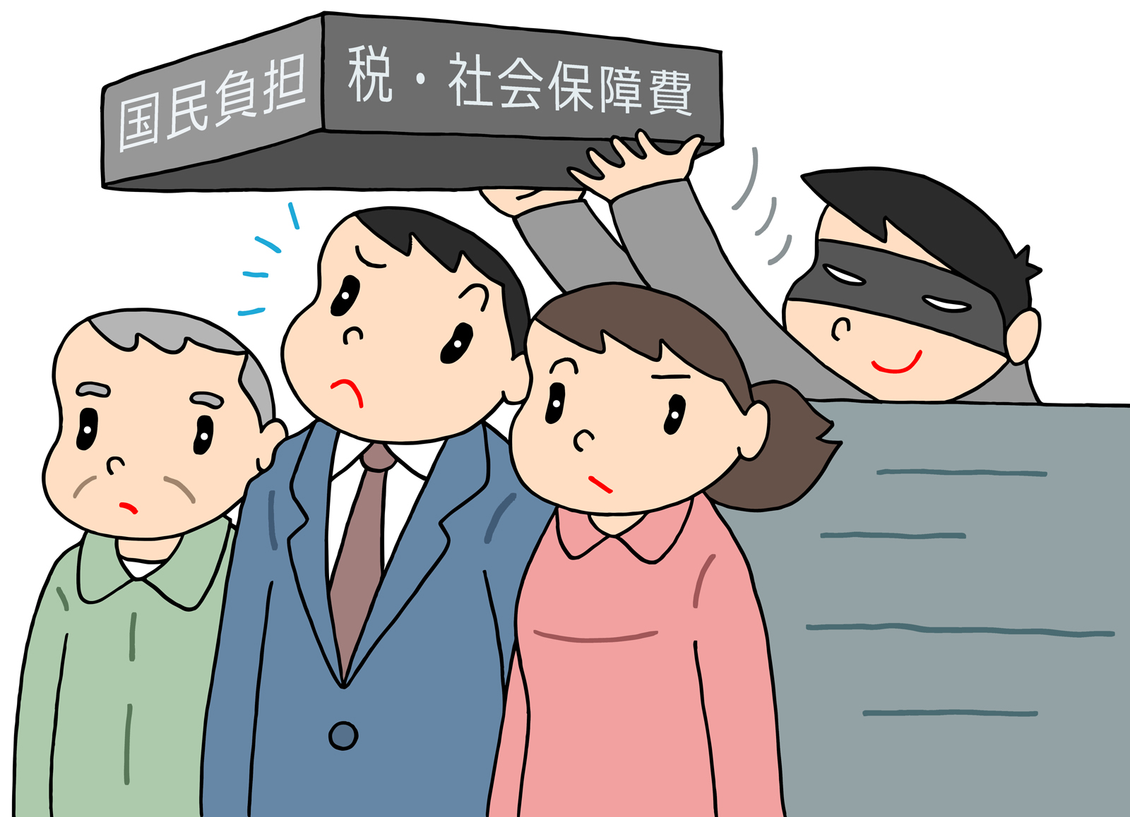 下に伸びている「紺色棒グラフが直接税の負担(所得税など)」で、上に伸びている「黄土色棒グラフが社会保険料」です。一番上の「白色棒グラフは間接税の負担(消費税など)」ですね。