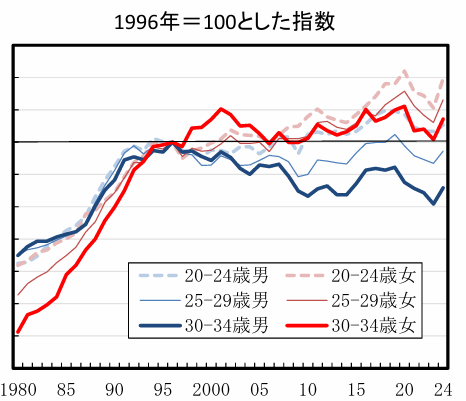④「男性の30~34歳は、1996~2024年の全ての期間で1996年比でマイナスだった」