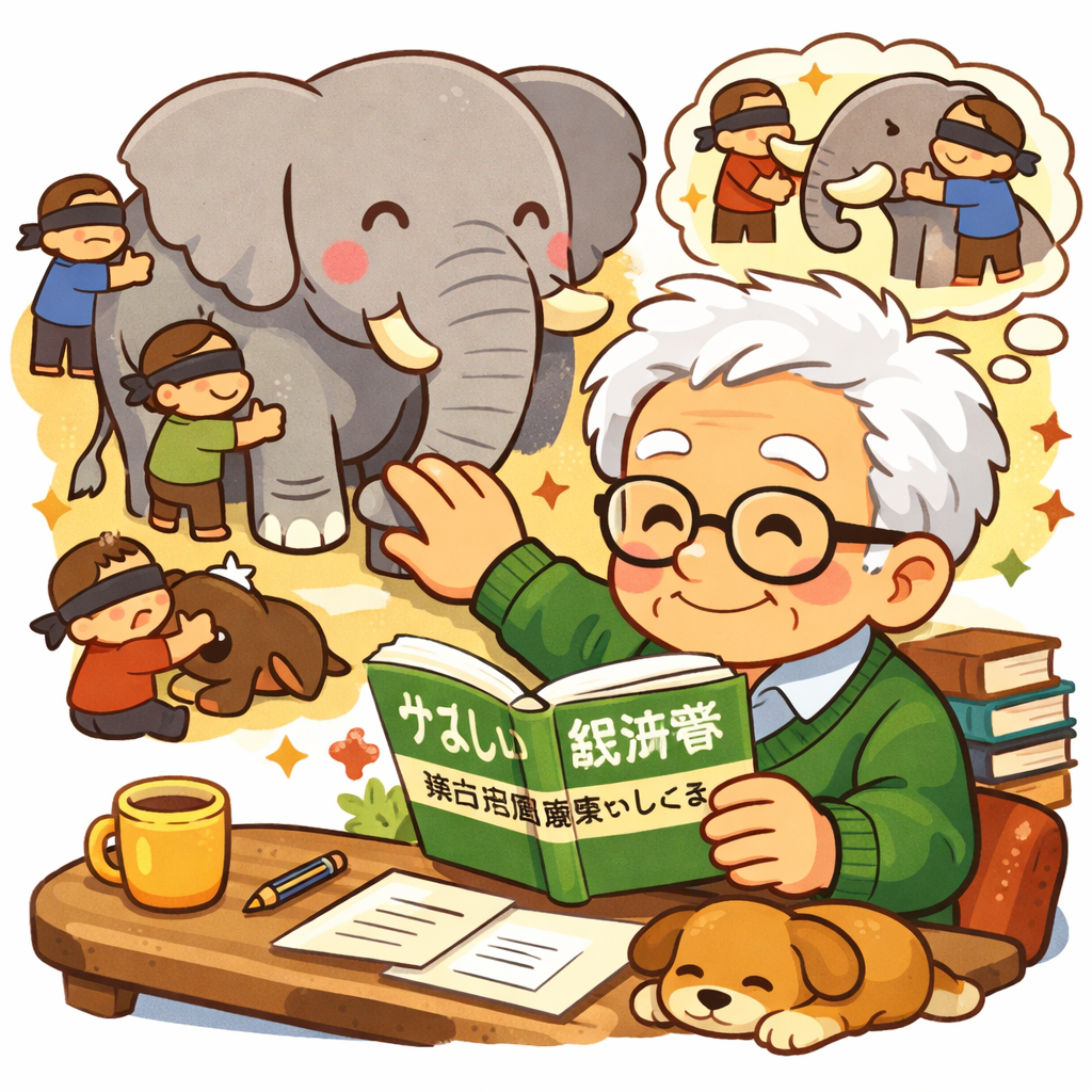 コロちゃんは、いつも「やさしい経済書」を読んでいてこの「群盲象を評す」が頭をよぎることがあるのですよね。