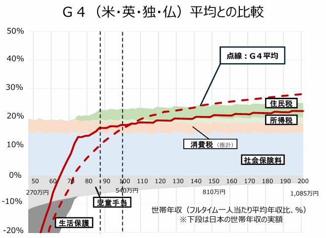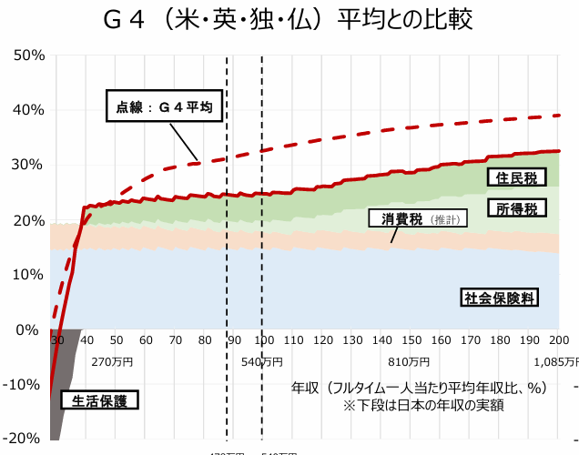 上記の赤い実線のラインが「日本」の「純負担率の年収別の推移」です。赤い点線のラインが「G4諸国」の「負担率の推移」ですね。