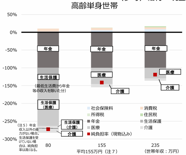 「内閣官房 高齢単身世帯の純負担率(現金+現物給付)」より