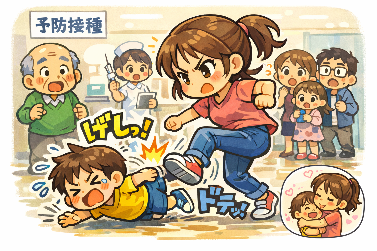 「母の話」によると、コロちゃんの妻と一緒に「自治体の会場」に「子どもの予防接種」に行ったのですよね。