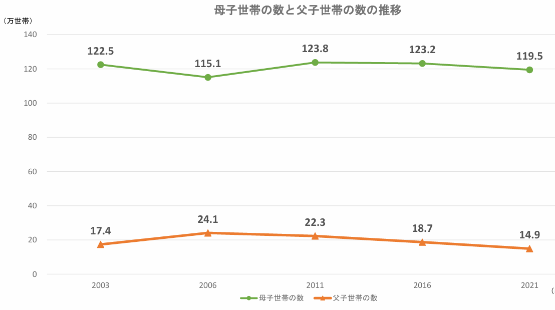 上記の「母子世帯・父子世帯の数の推移」を見ると、2003年~2021年の19年間の間で「約120万世帯」で推移しており、ほとんど減っていません。