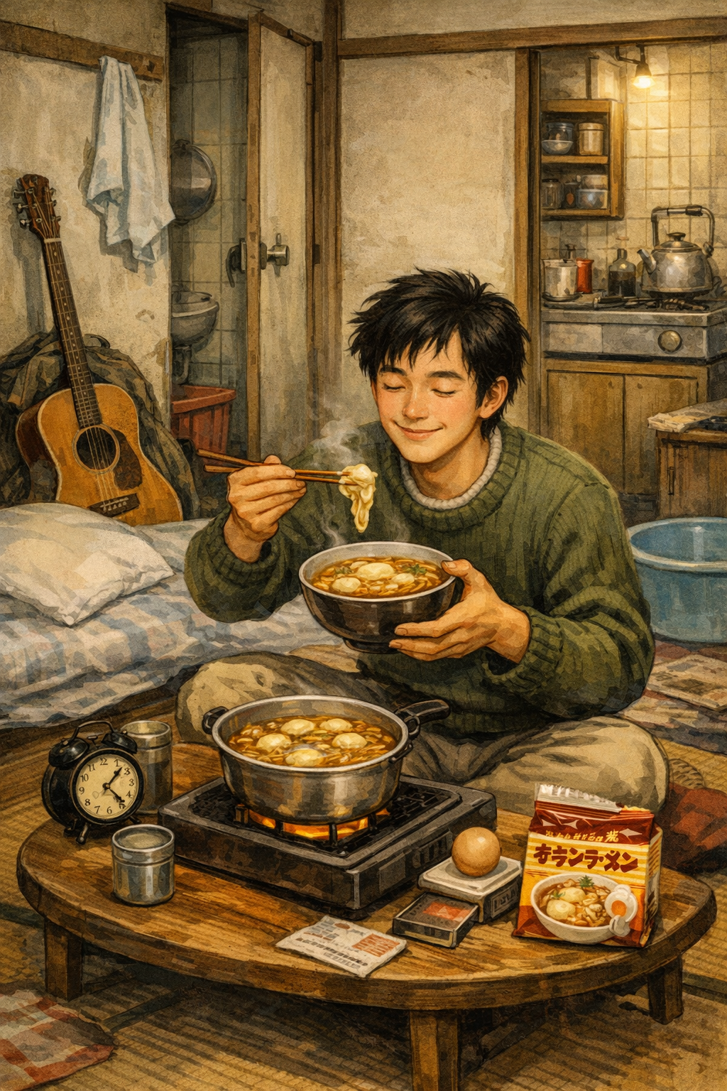この「狭いアパートの部屋」で、よく青年コロちゃんが食べていたのは、「日清食品」の「チキンラーメン」でした。