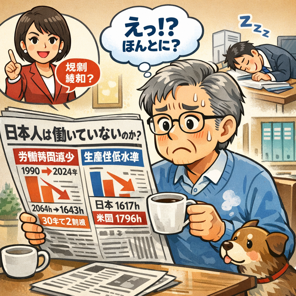 コロちゃんが、朝コーヒーを飲みながら新聞をバサバサ読んでいると「日本人は働いていないのか/時間は減少、生産性も低水準」との見出しが目に入りました。