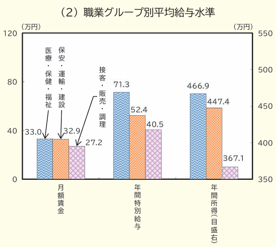 「③年間所得」で見ると、「医療・保健・福祉:466万円」と「接客・販売・調理:367万円」とでは、「年間100万円近い差」がありますよ。