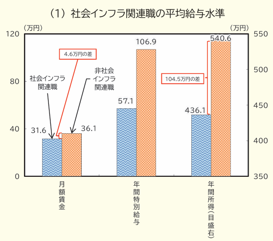 そして、これらの「社会インフラ関連種」と「非社会インフラ関連職」の賃金を、以下のように比較していますね。