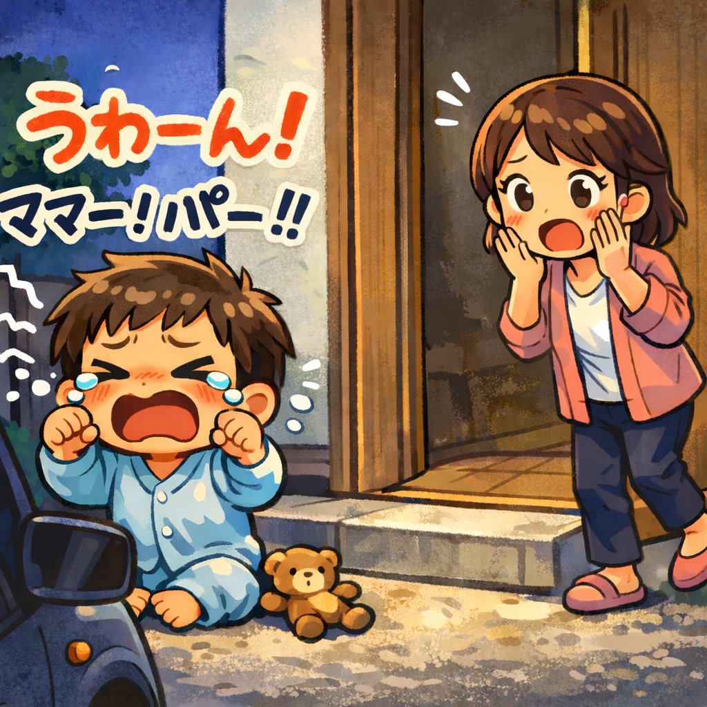 なんと「玄関のドアの外で4歳の幼児」が、ぎゃぎゃーと「ギャン泣き」している姿があったのですよね。