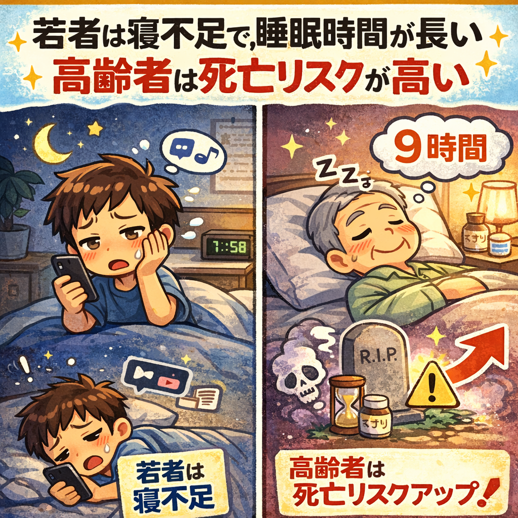 今日のテーマは、「若者は寝不足で、睡眠時間が長い高齢者は死亡リスクが高い」を考察してみましたよ。