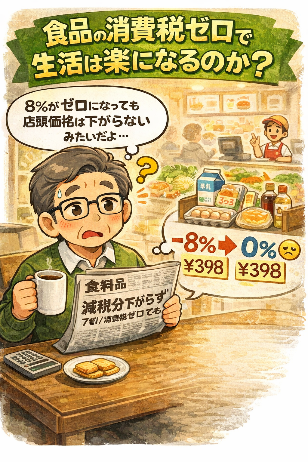 コロちゃんが、朝コーヒーを飲みながら新聞をバサバサ読んでいると「食品『減税分下がらず』7割/小売調査/消費税ゼロでも」との見出しが目に入りましたよ。