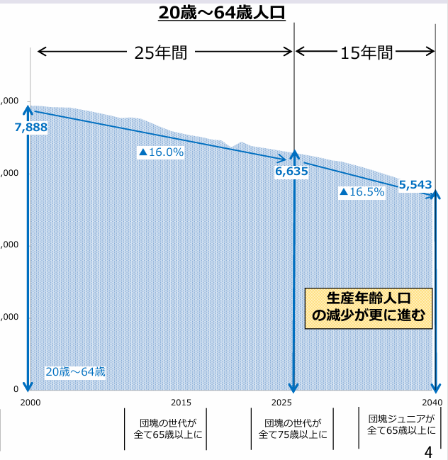上記を見ると、「20~60歳の人口」はこれまでの「25年間は年平均0.64減」でしたが、今後の「15年間は年平均1.10%減」と、より急角度に「人口減少が進むこと」を示していますね。