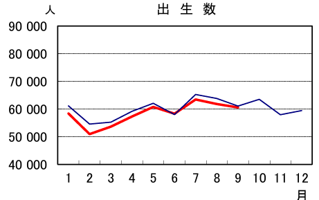 うーむ、上記のグラフの「赤色ライン」が「今年の出生数」なんですよね。