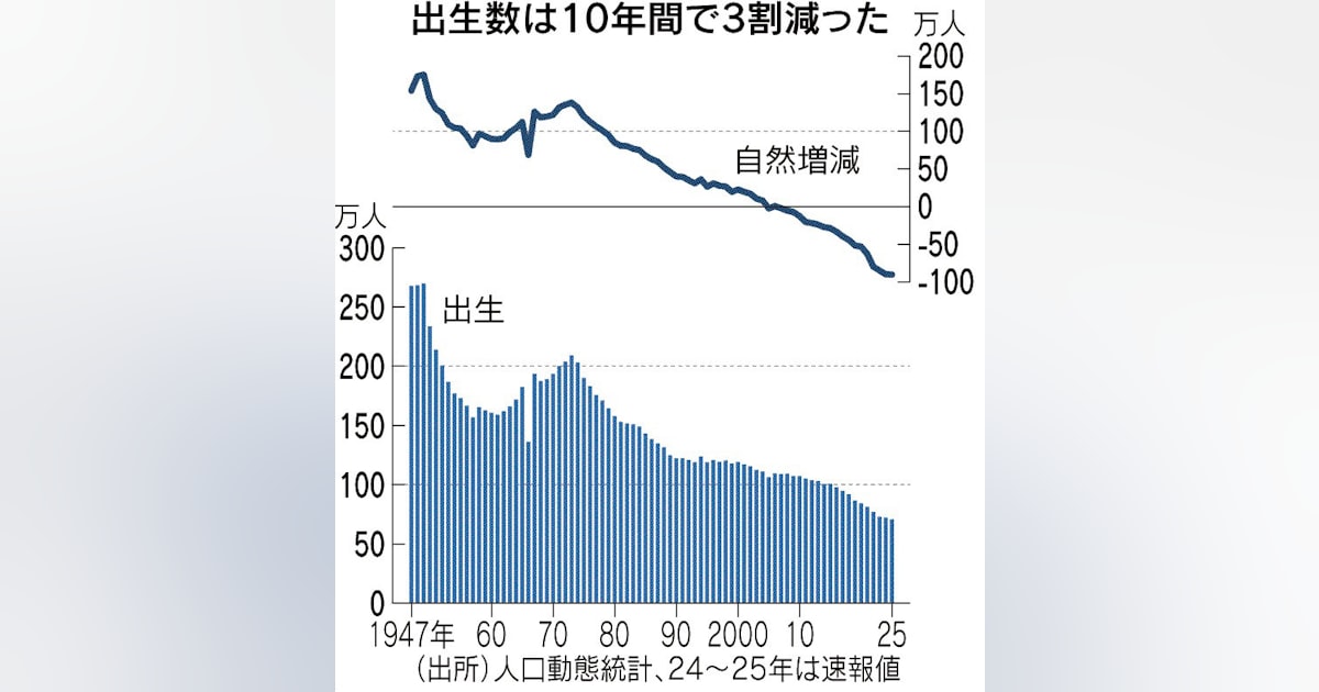 この記事を読むと、「昨年2025年に生まれた子供の数は前年比2.1%減の70万5809人だった」と報じていますよ。