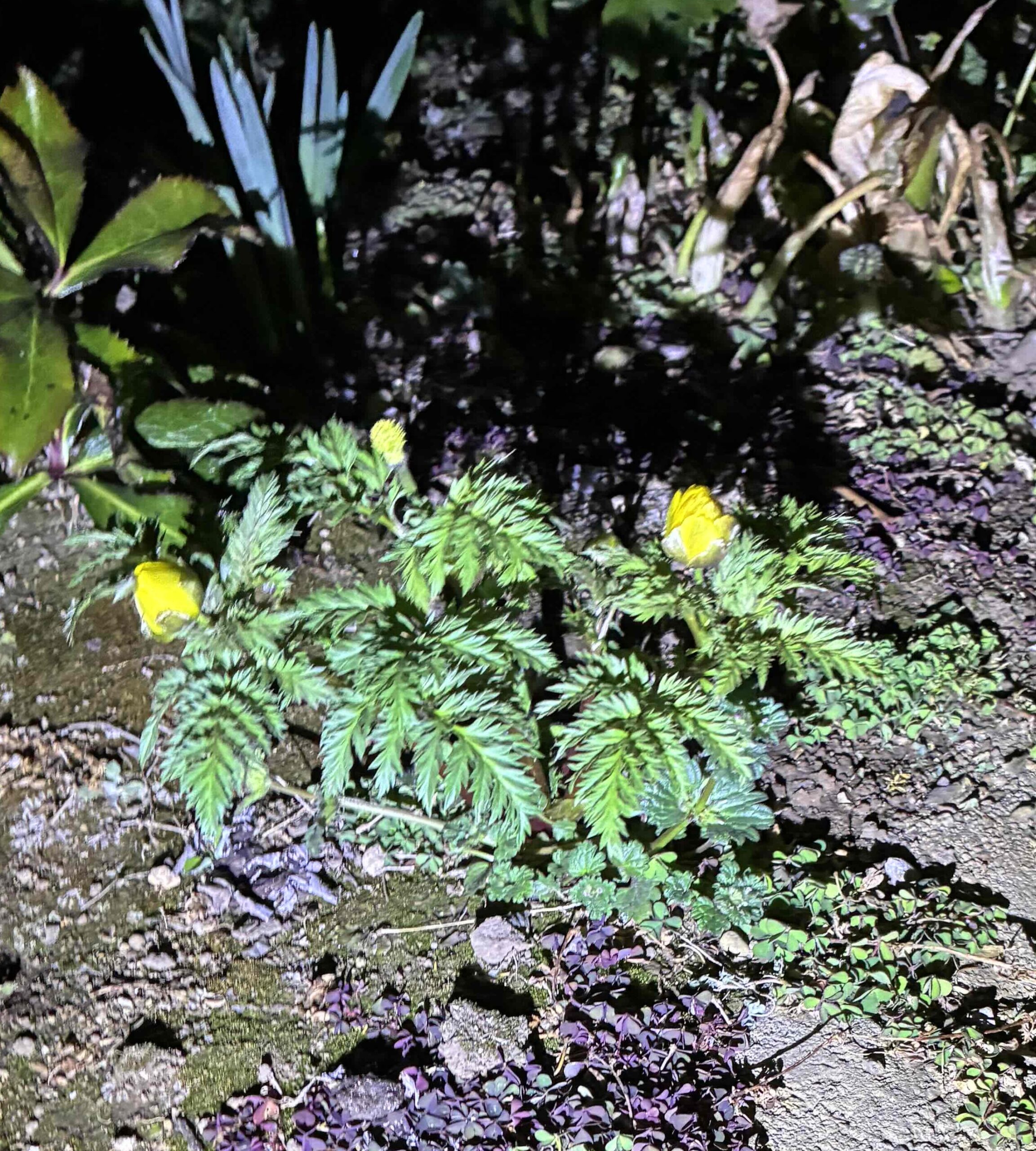 コロちゃんは、日中にこの「福寿草」がきれいに咲いているのを見ていましたから、「あれ?花って夜にはつぼんじゃうの?」と首を傾げましたね。下記のフォトですよ。