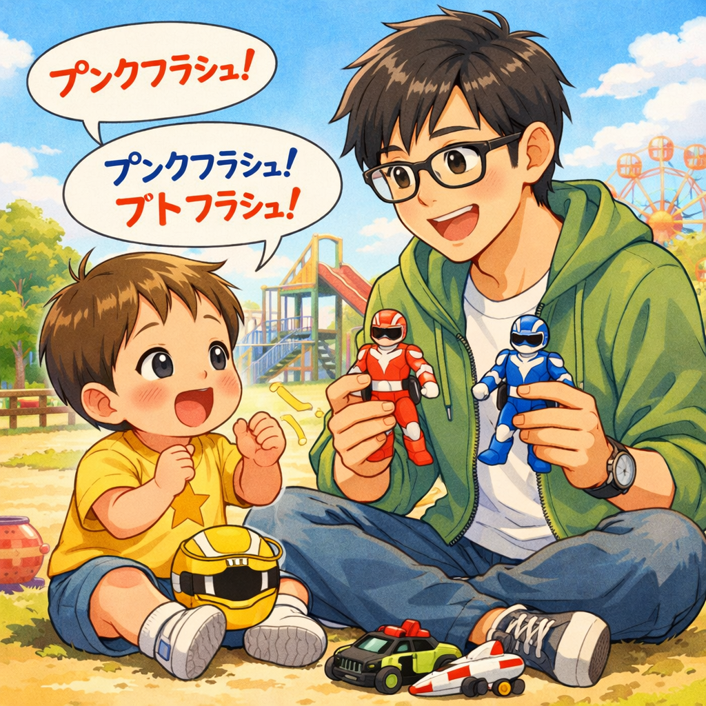 そして、当時流行していた「戦隊ヒーローもの」の「フラッシュマンシリーズ※」のおもちゃをあげたら、「プンクフラシュ・ブドフラシュ」と舌足らずの言葉を発したのですよね。