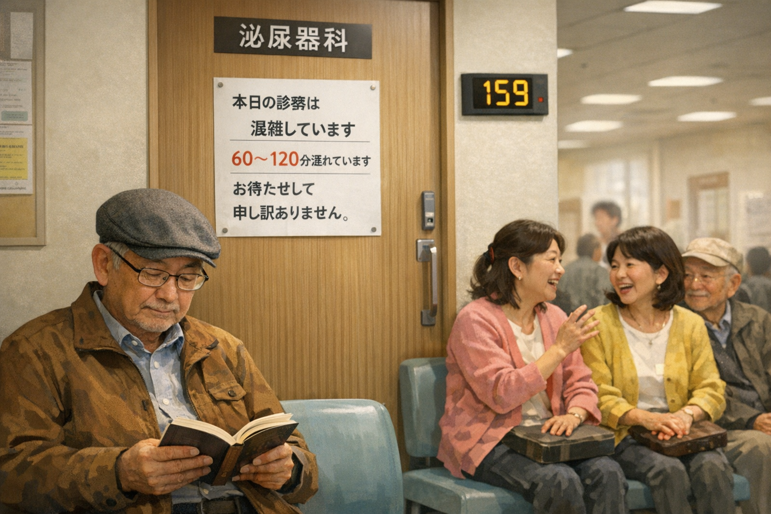 そうしましたら、「主治医の診察室のドア」に「本日の診察は混雑していて60~120分遅れています。お待たせして申し訳ありません」との表示がありました。