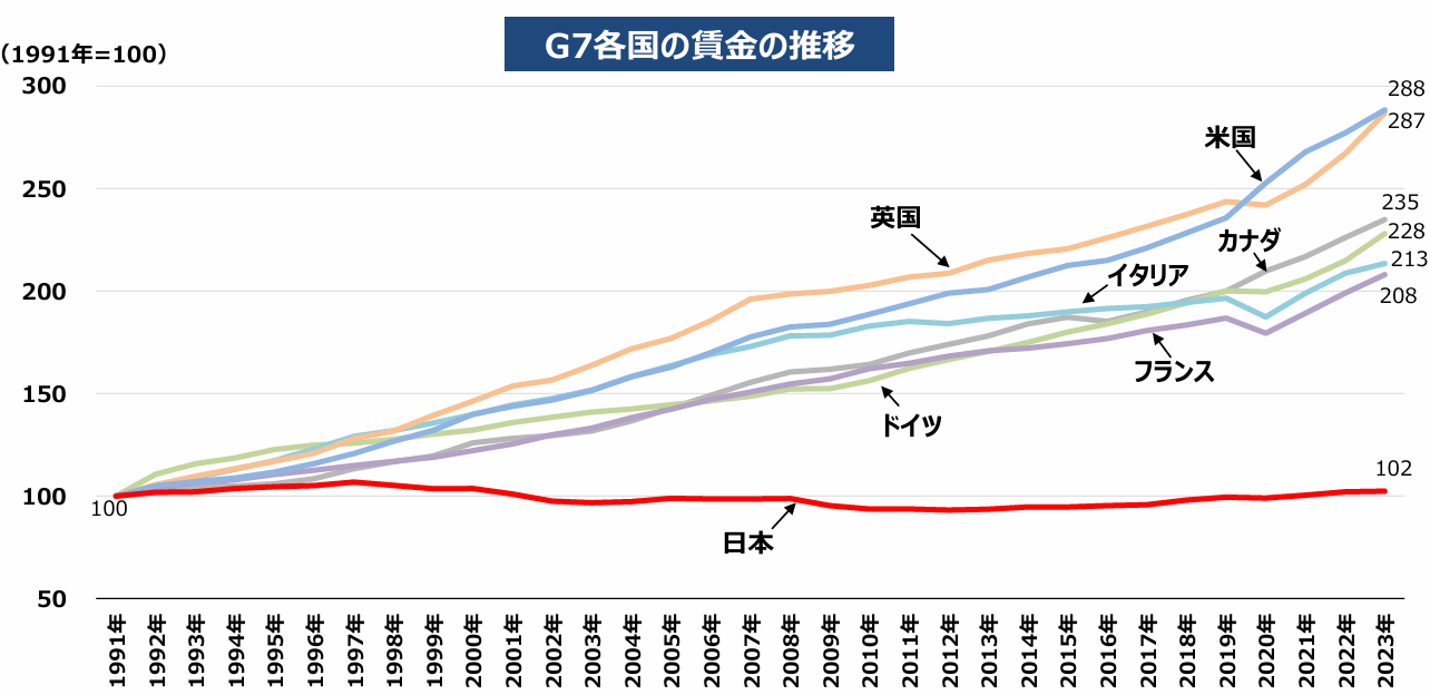 上記のグラフは、「内閣官房」が発表した1991~2023年の「G7各国の1人あたり賃金の推移」です。