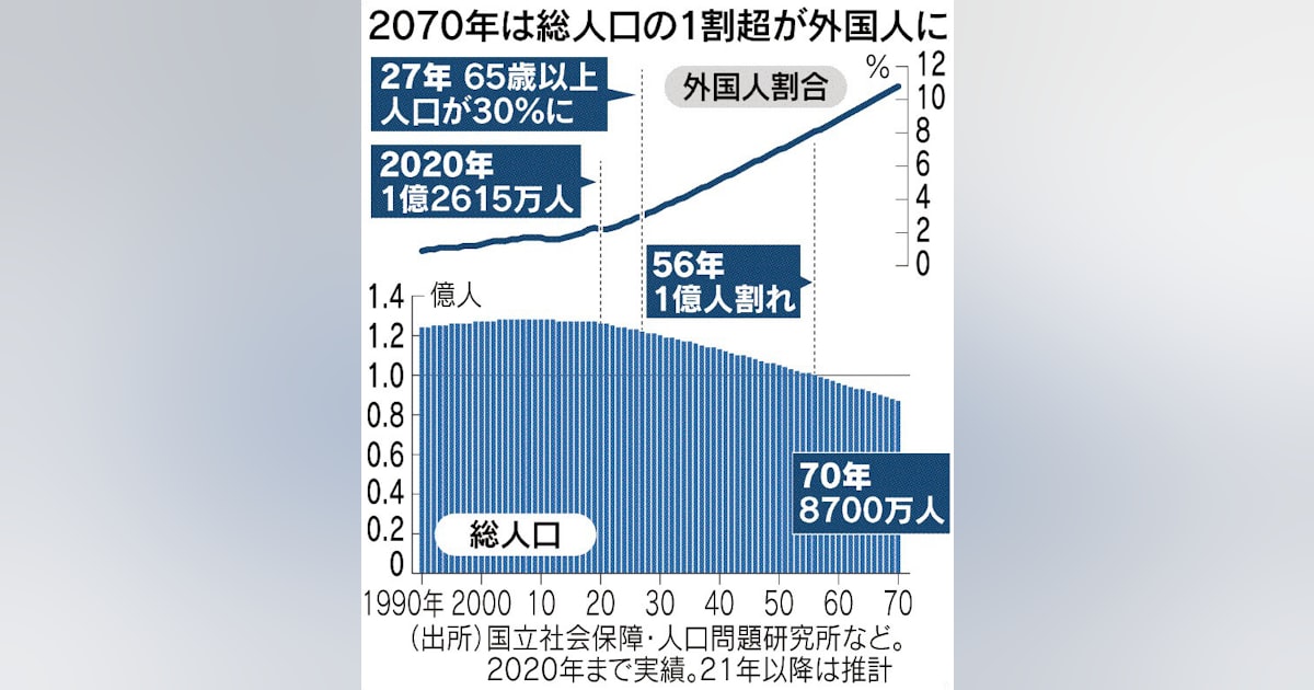 新聞記事では、「2070年には、総人口は現在の1億2600万人から、3割減の8700万人に減り、65歳以上人口の比率は20年の28.6%から70年には38.7%に上がる」
