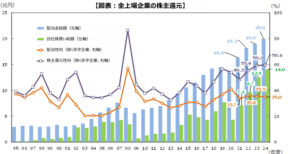 上記のグラフは、「経済産業省」が発表した「1995~2024年」の「全上場企業の株主還元」の推移です。