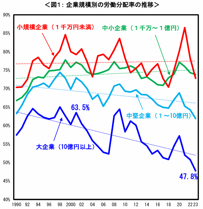 上記のグラフは、「内閣府」が発表した1990~2023年の「企業規模別の労働分配率の推移」です。この中の「大企業の青色ライン」にご注目ください。